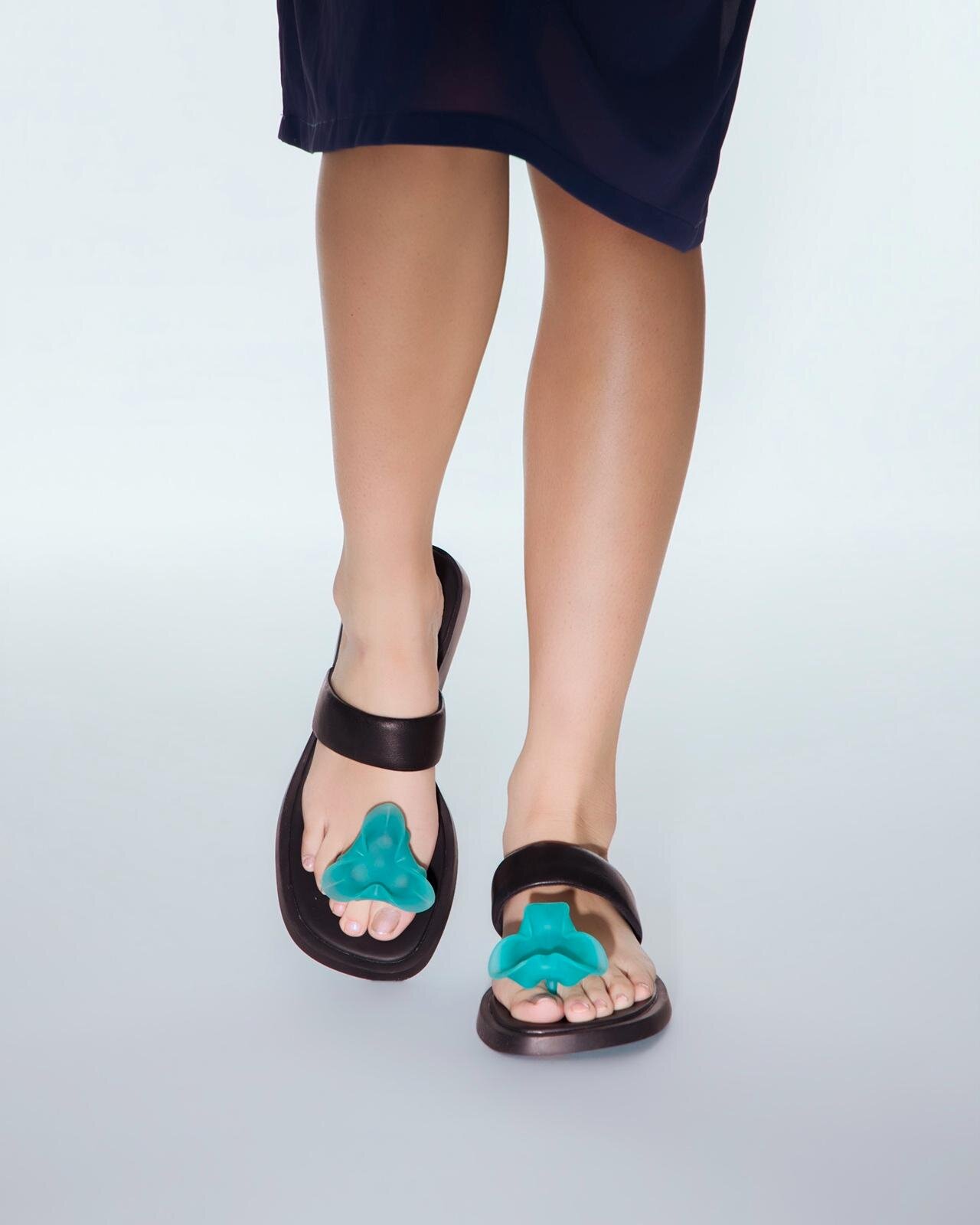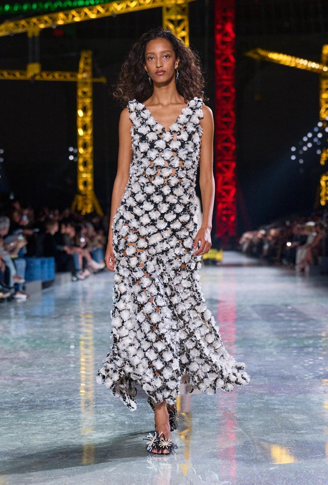 一款鬱金香造型的手提包,搭配鞋帶圖案元素飾有花朵圖案的涼鞋。這種將立體元素融入包包和鞋子設計的做法獨樹一格。